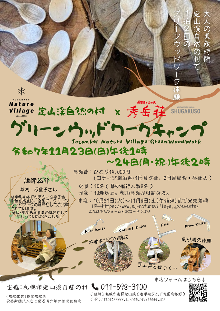 詳細につきましてはイベント情報「定山渓自然の村×秀岳荘 グリーンウッドワークキャンプ」をご確認ください。