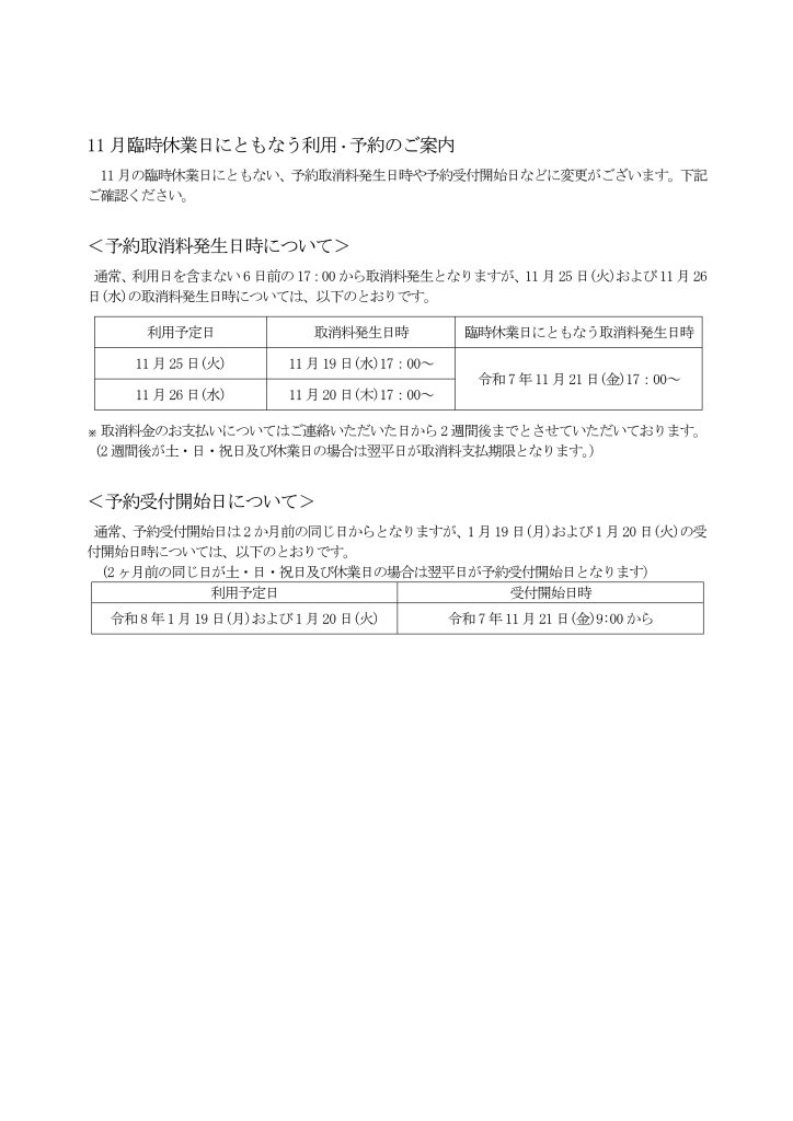 ※なお臨時休業日の前日11月18日(火)からの宿泊については通常どおり翌日11月19日(水)11時30分までのチェックアウトとなります。延長のご利用はできませんのでご理解ください。